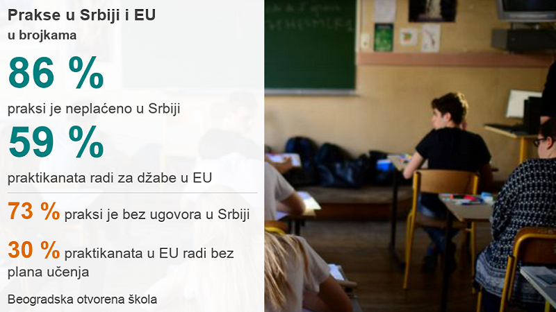 Ono što je i dalje veoma alarmanto jeste to da u Srbiji ne postoji adekvatna ugovorna forma za regulisanje odnosa između „praksodavaca“ i praktikanata, kao i da ne postoje jasni mehanizmi za obezbeđivanje kvaliteta radnih praksi, dodaju u Beogradskoj otvorenoj školi.