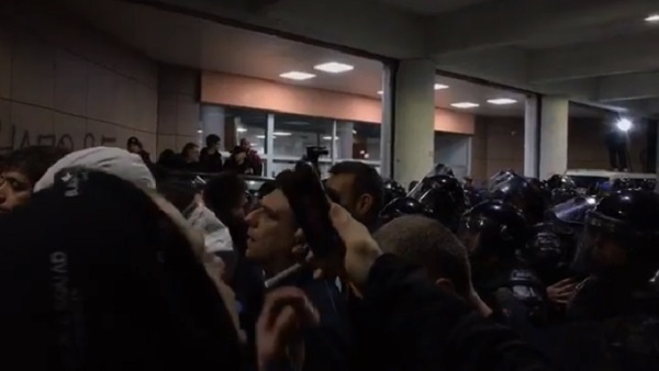 Policija je napravila kordon ispred ulaza u zgradu u Aberdarevoj ulici. Kako javlja reporter agencije Beta, policija polako sa štitovima, metar po metar potiskuje građane, koji takođe pokušavaju da odguraju policiju.