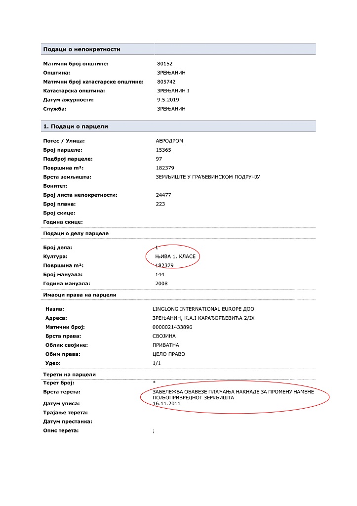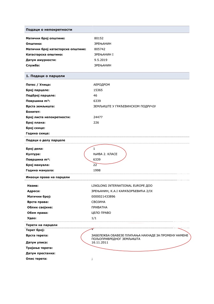 U izvodu iz katastra, koji je Građanski preokret poslao portalu, piše da su parcele na kojima Šandong Lilnglog gradi fabriku automobilskih guma kategorisane kao njive prve i druge klase.