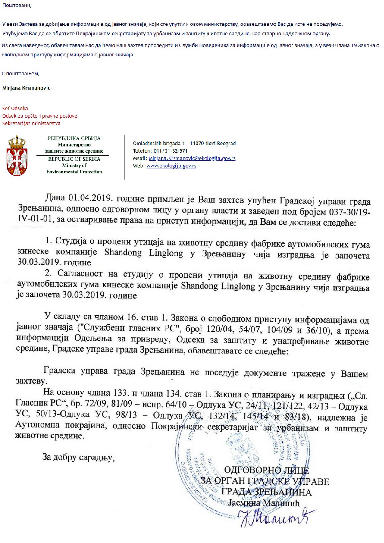 I Ministarstvo zaštite životne sredine i Gradska uprava Grada Zrenjanina naglasili su da je stvarno nadležni organ u ovom slučaju Pokrajinski sekretarijat za urbanizam i zaštitu životne sredine. Taj organ nije u zakonskom roku odgovorio na zahtev da dostavi kopiju studije i saglasnost na nju, zbog čega je upućena žalba Povereniku za informacije od javnog značaja.