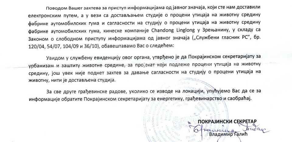 Pokrajinski sekretarijat za urbanizam i zaštitu životne sredine, nakon intervencije Poverenika za informacije od javnog značaja, odgovorio je da mu nije podnet zahtev za davanje saglasnosti na studiju o proceni uticaja na životnu sredinu niti mu je dostavljena takva studija kineske kompanije za proizvodnju automobilskih guma „Šandong Linglong“, saopštio je danas Građanski preokret.