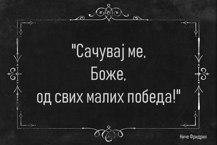 Kad se umreže, a uvek se umreže, magijski pogled na svet sa alavošću i gramzivošću, dobije se savremeno srpsko društvo – društvo čiji je najveći uspeh, u poslednjih godinu dana, što se Novak Đoković povratio i što ponovo pobeđuje, da ne pominjem najveći istorijski uspeh – izvoz papaka i svinjskih glava u Kinu. Kako malo nama treba za pobedu! Duboki osećaj inferiornosti, koji nosimo u sebi i koji nas tera da imitiramo Zapadnjake, daje nam moć da se zadovoljavamo malim i nevažnim pobedama. Što bi Niče rekao: „Sačuvaj me, Bože, malih pobeda!“