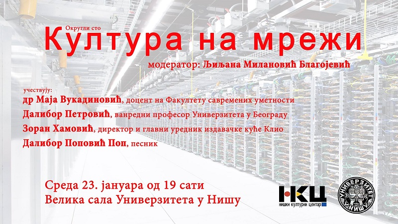 Niški kulturni centar i Univerzitet u Nišu organizuju u sredu 23. januara od 19 sati u Svečanoj sali Univerziteta okrugli sto „Kultura na mreži“.