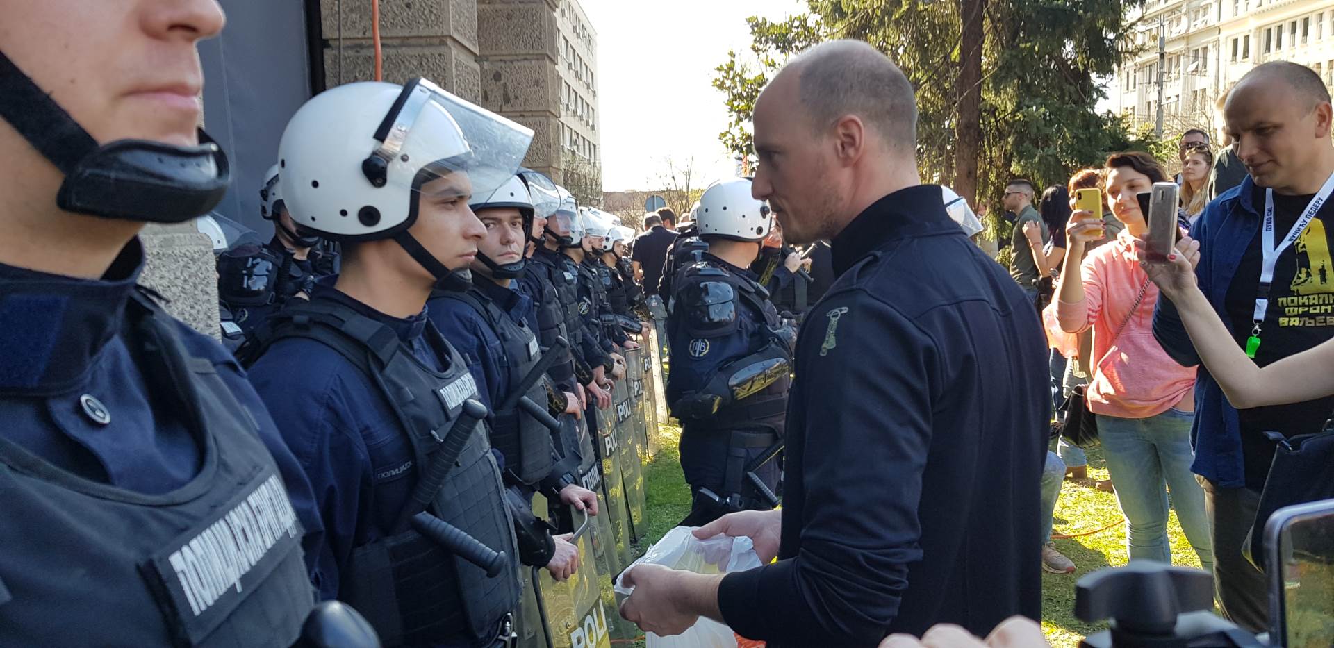Balša Božović iz Demokratske stranke delio je ispred Predsedništva policajcima, koji čuvaju zgradu, čokoladice.
