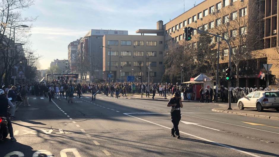 Demonstranti su se, na putu do policijske stanice u Ulici 29. novembra, zaustavili i ispred zgrade RTS-a i uzvikivali direktoru tog javnog servisa Draganu Bujoševiću „ostavka“.
