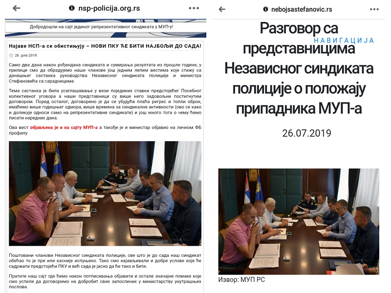 Ministar navodi da je obavljen razgovor sa predstavnicima NSP o položaju pripadnika MUP-a, dok NSP pompezno najavljuje da će navodno novi PKU biti najbolji do sada… NSP navodi da su u prilici da „obraduju“ svoje članstvo „jednim lepim vestima koje stižu sa sastanka rukovodstva NSP i minstra“, gde na dalje ističu da je navodno „dogovoreno“ plaćanje regresa i toplog obroka, kao i „više vremena za sindikalne aktivnosti“, navodeći da se to odnosi samo na „njih“, koji su sada jedini reprezentativni sindikat u MUP-u.