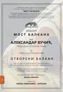 Istim povodom u Ambasadi Republike Srbije u Skoplju uručena je Plaketa „MOST BALKANA“, koju je uredjivački savet Radija MOST ustanovio prošle godine , Aleksandru Vučiću za doprinos zbližavanju naroda Balkana kroz inicijativu OTVORENI BALKAN, a koju je primila ambasadorka Republike Srbije Nevena Jovanović.