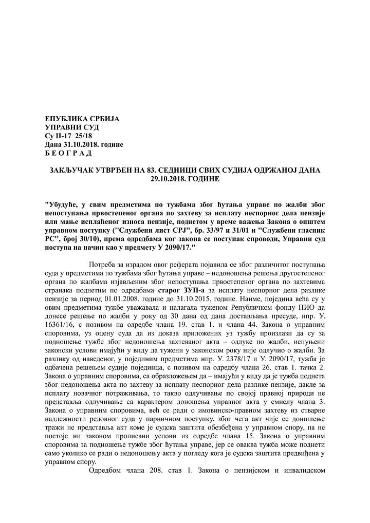 „Ubuduće, u svim predmetima po tužbama zbog ćutanja uprave po žalbi zbog nepostupanja prvostepenog organa po zahtevu za isplatu nespornog dela penzije ili manje isplaćenog iznosa penzije, podnetom u vreme važenja Zakona o opštem upravnom postupku (“Službeni list SRJ“, br. 33/97 i 31/01 i “Službeni glasnik RS“, broj 30/10), prema odredbama kog zakona se postupak sprovodi, Upravni sud postupa na način kao u predmetu U 2090/17.“