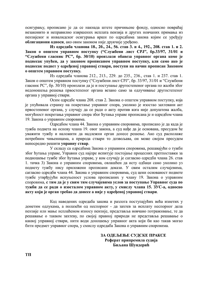 – Zaključak Upravnog suda Srbije na 83. sednici održanoj 29.10. 2018. godine da se zahtevi za priznavanje prava na isplatu razlike između isplaćene i penzije po rešenju, ne mogu rešavati u upravnom postupku i postupku pred Upravnim sudom nego u parničnom postupku.