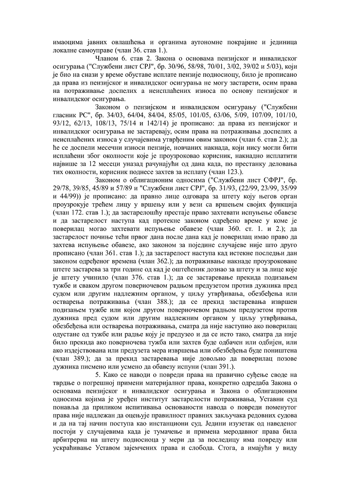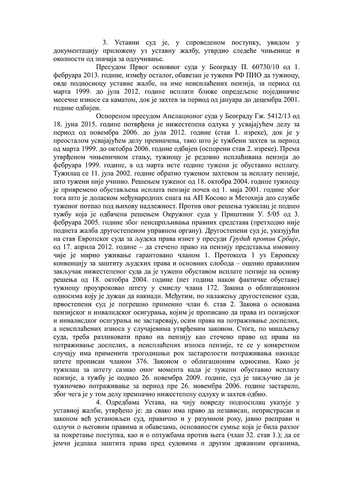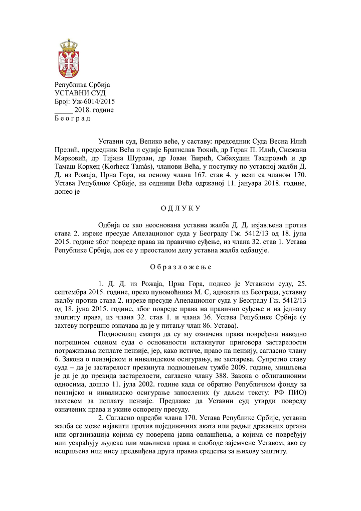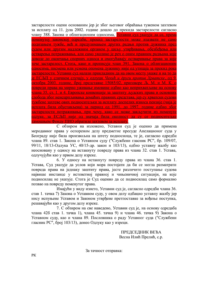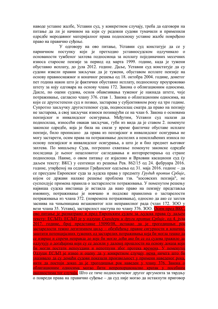 – Zauzet stav u Odluci Ustvnog suda Srbije broj: Už-6014/2015 od 11. januara 2018. godine, kojim se zahtevi za isplatu neisplaćenih penzija stariji od 3 godine smatraju zastarelim uz pozivanje na stavove ESLjP u Strazburu,