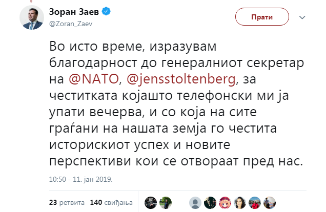 Istovremeno Zaev nije izdržao a da se ne zahvali i generalnom sekretaru NATO saveza Jensu Stoltenbergu i da obraduje Makedonce vešću da je telefonom razgovarao sa Jensom.